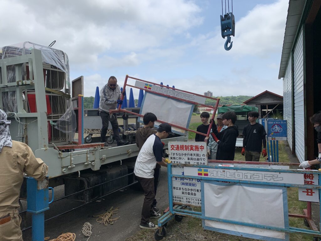昨日は、使用する資材を、お借りしている郊外の倉庫から、開催会場隣接の資材庫スペースまで移動する作業を行いました。